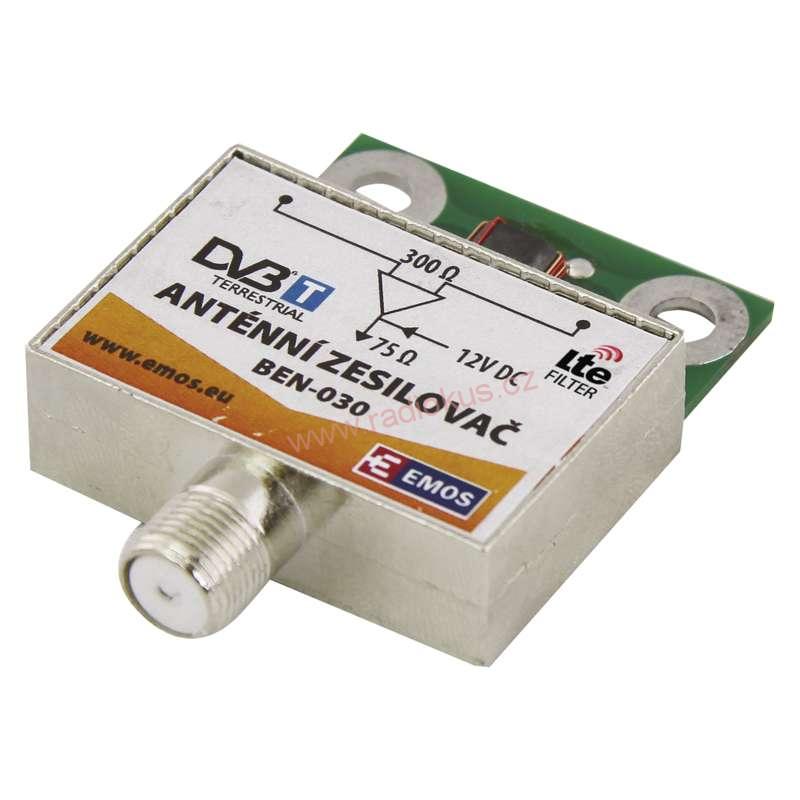 BEN-030 předzesilovač je určen pro montáž do anténní krabičky se zesílením 30 dB. Zesilovač je v kovovém krytu čímž odrušuje vnější vlivy a je zakončen konektorem F. Pracuje v pásmu BIII, IV, V a má certifikaci CE. Rozteč děr je 27 mm.