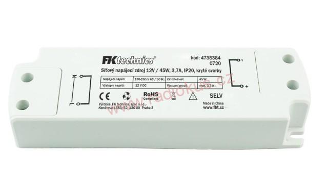 - Síťový napájecí zdroj 12V / 45W, 3,7A, IP20, kryté svorky