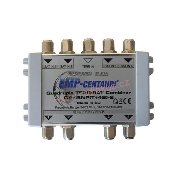 Slučovač TV/SAT 4x EMP C5/4ENP-2 (E.107-A) pro sloučení čtyř satelitních vstupů 950-2150 MHz (čtyř družic) a jednoho televizního 5-862 MHz (pozemního, terestrického) vstupu do čtyř nezávislých výstupů. Pro vnitřní použití.