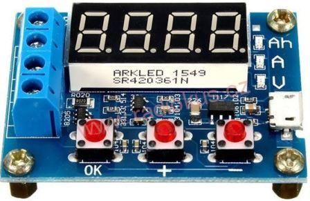 Modul změří kapacitu článku nebo baterie s napětím 1,5–12V pomocí měření času, vybíjecího proudu a svorkového napětí. Údaje o aktuálně naměřené kapacitě, odebíraném proudu a svorkovém napětí se v průběhu měření postupně zobrazují na displeji až do nastavené hodnoty koncového napětí. Poté modul odpojí článek nebo baterii od zátěže a zobrazí její kapacitu. Možnost korekce koncového napětí nebo kalibrace měřeného napětí a vybíjecího proudu.