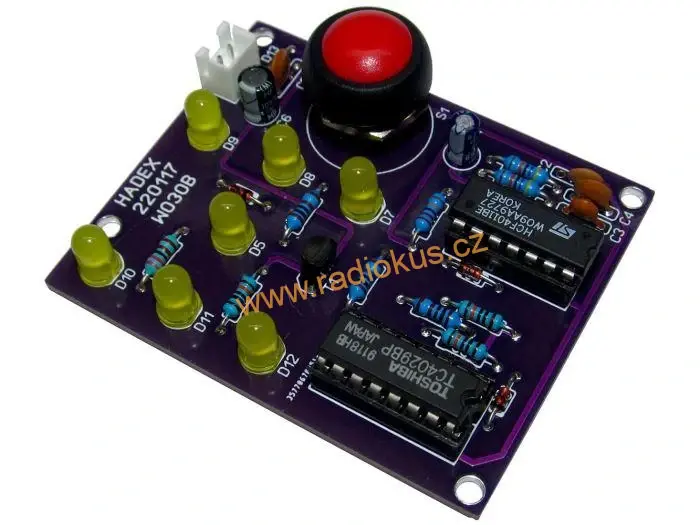Po stisku tlačítka blikají v rychlém sledu LED a po uvolnění se blikání zpomaluje až do zastavení v náhodné kombinaci 1–6.