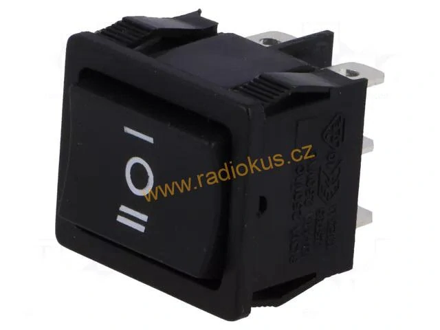- Kolébkový přepínač 6A / 250V , černý , 24 x 21 mm , s mezipolohou ,aretovaný