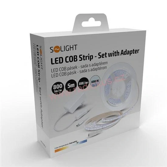 - LED COB pásek, sada s adaptérem, vypínač, 5m, 8W/m, 800lm/m, studená bílá