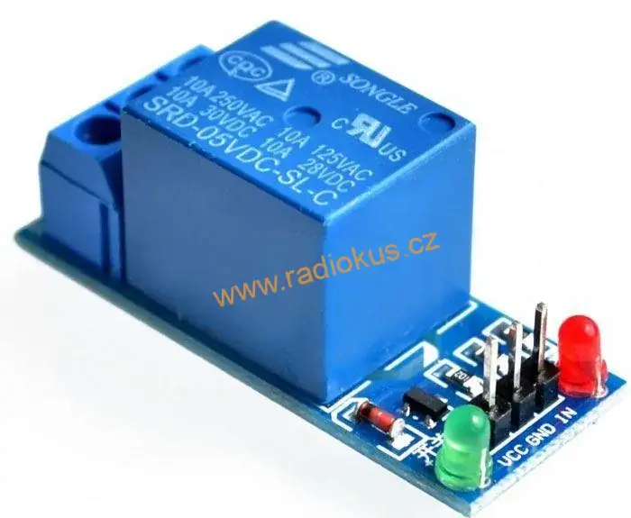 1 kanálový relé modul s napájecím napětím 5V a spouštěný signálem Log 0 (10mA). Kontakty relé AC250V 10A / DC30V 10A.