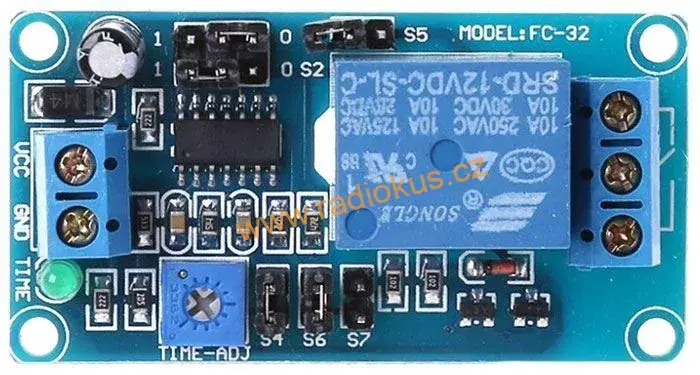 S5 – propojka pro přivedení napájecího napětí na kontakt relé. Relé může mít samostatné kontakty (nepropojeno) nebo s napěťovým potenciálem 12V (propojeno). Potom může rovnou spínat spotřebič 12V.