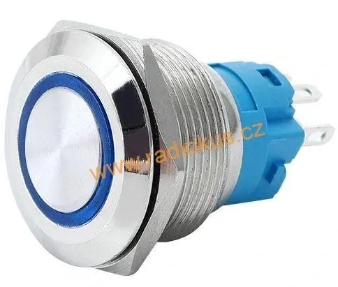 - Přepínač tlačítkový ON - ( ON ) bez aretace, kovový , 5A/250V , Antivandal provedení , LED 12-24V modrá , IP67