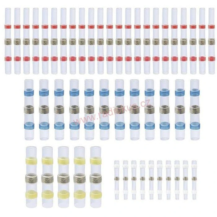 50ks kabelových spojek s cínem a smršťovačkou. Vhodné pro spojování automobilové a jiné kabeláže.
